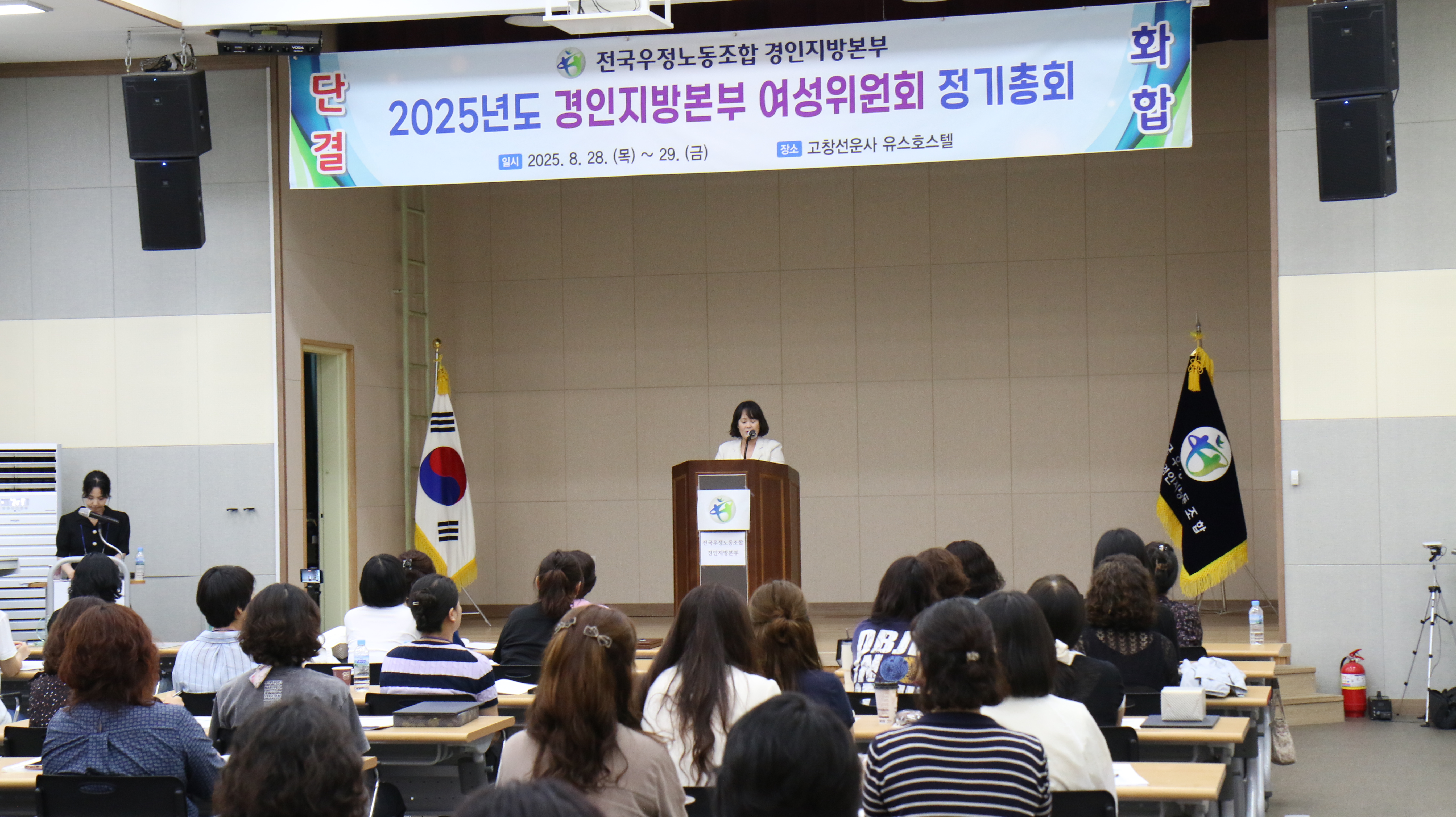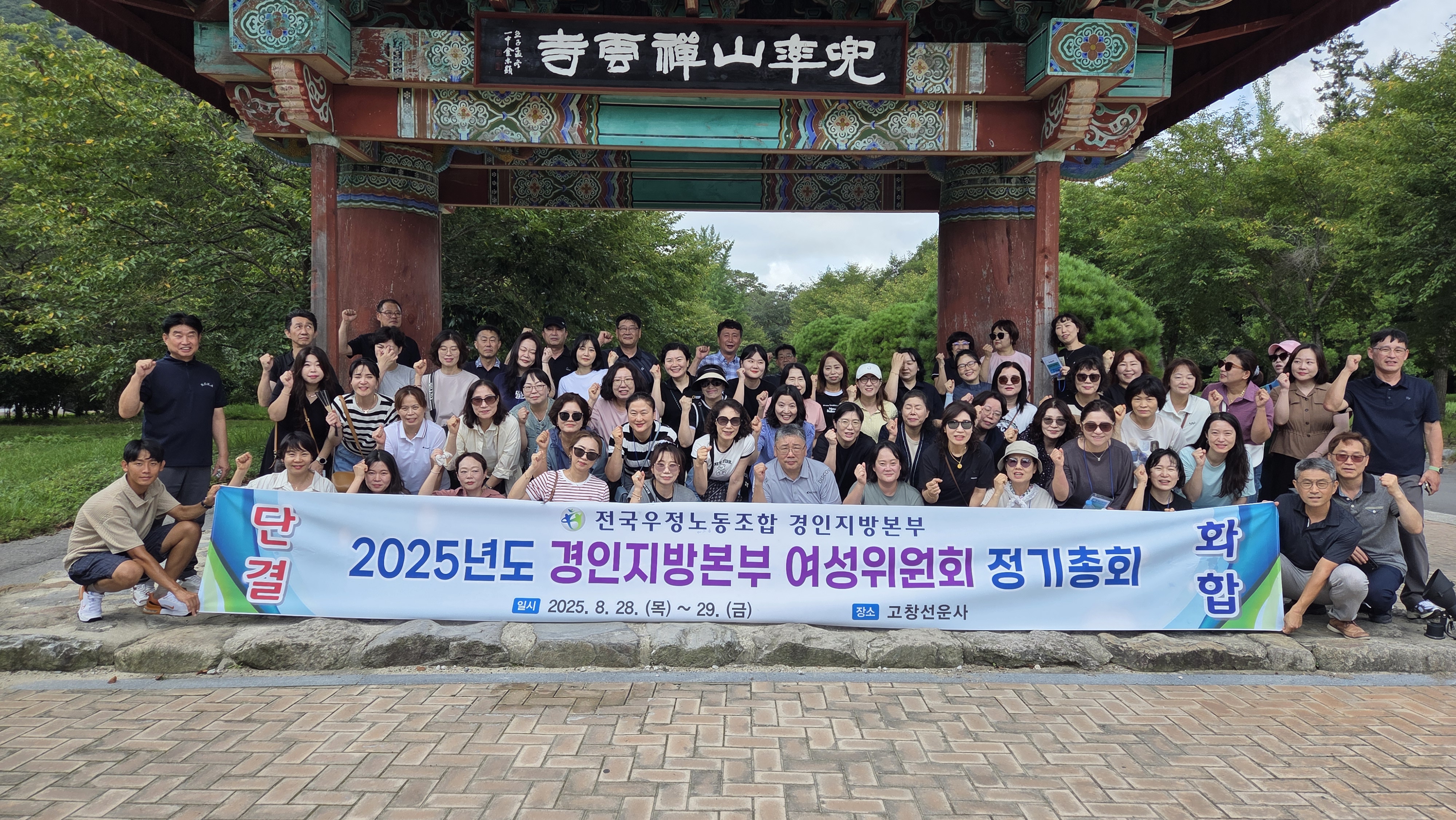 전국우정노동조합 경인지방본부(위원장 유익상)는 2025.08.28.~08.29에 고창 선운사 유스호스텔에서 '2025년도 경인지방본부 여성위원회 정기총회'를 성황리에 개최하였다. 이 날 행사에는 전국우정노동조합 이재규 위원장을 비롯하여 전북지방본부 이행무 위원장 등 조합본부 간부들이 대거 참석하여 자리를 빛내 주었다.