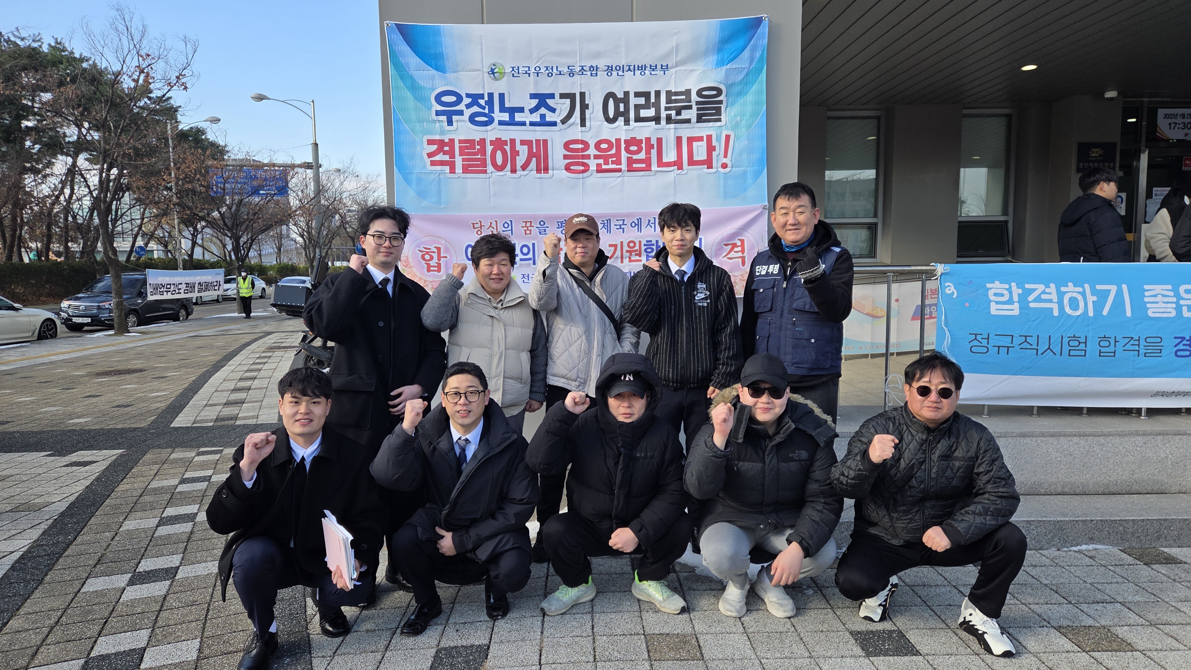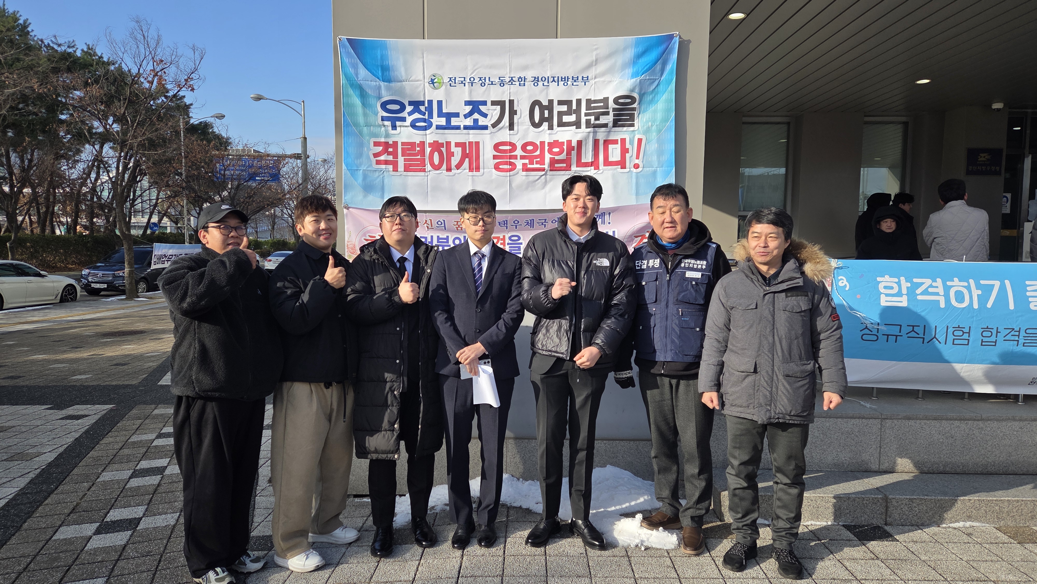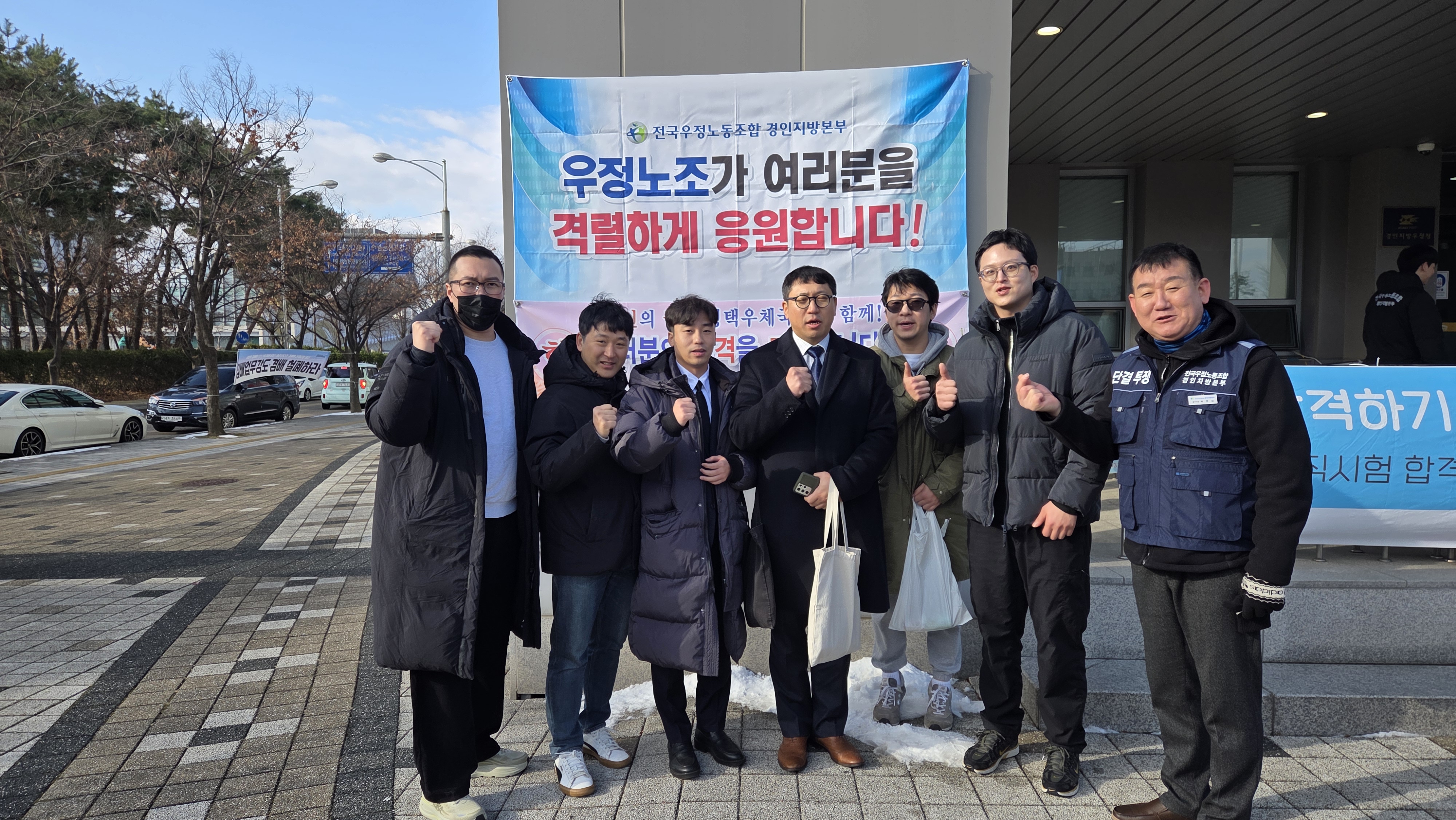 경인지방본부(위원장 유익상)는 2025년 12월6일 토요일에 경인지방우정청에서 실시한 집배공무원 경력채용 면접시험에 응시한 예비조합원을 추운날씨에도 불구하고 이른 아침부터 각 지부의 지부장 및 부서장들과 함께 격려하였다.