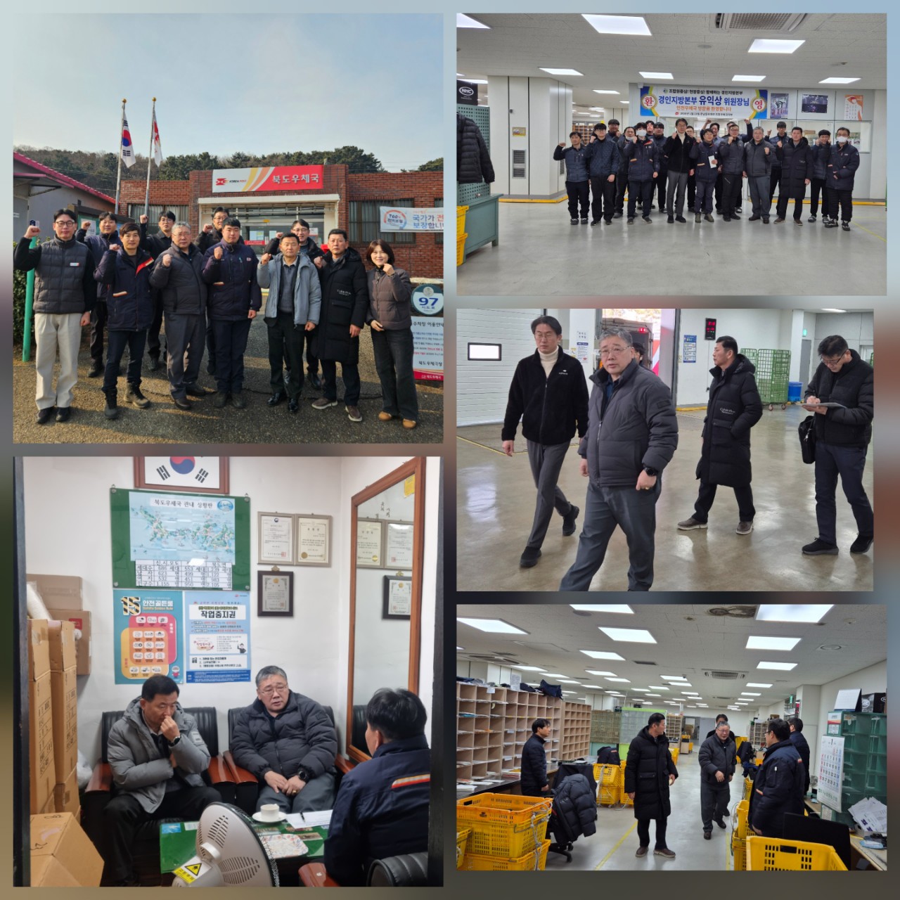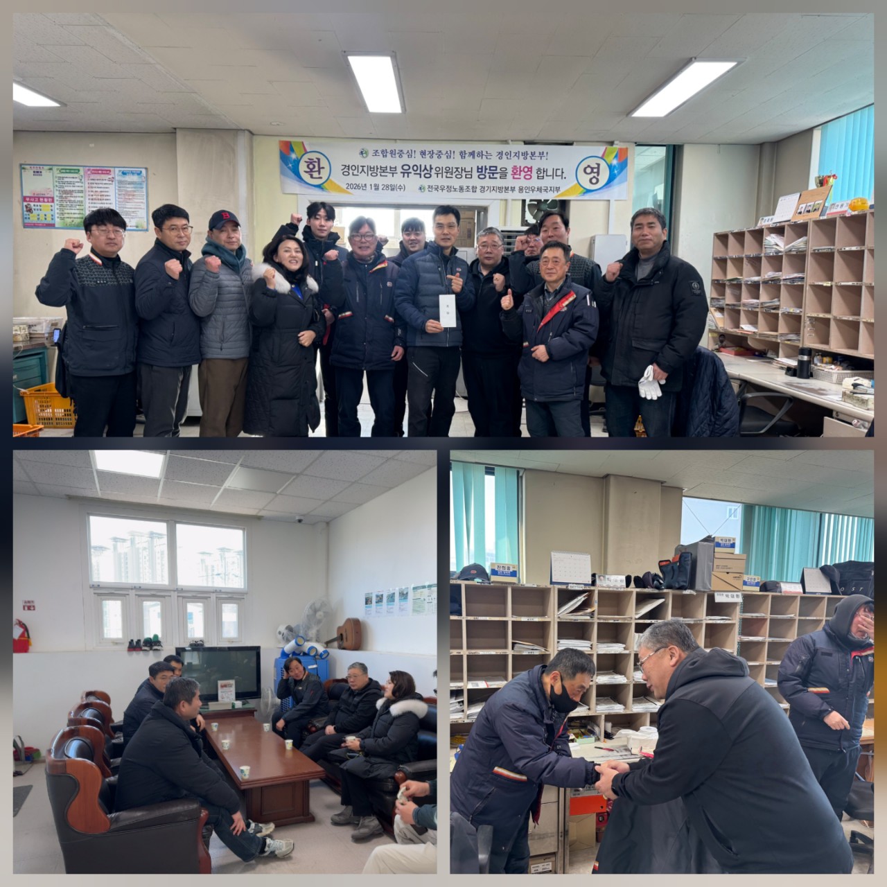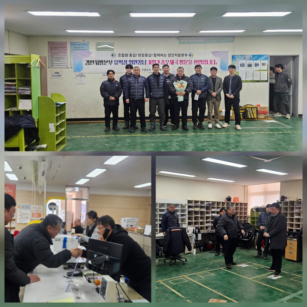 경인지방본부(유익상)는 1.21.(수)~2.3.(화)까지 10곳의 총괄국 및 센터국 설 소통격려 방문을 하였으며, 1.26.(월) 조합본부 이재규 위원장과 함께 김포우체국지부, 계양우체국지부를 방문하여 조합원들을 격려하고 현장의견을 청취하였다.