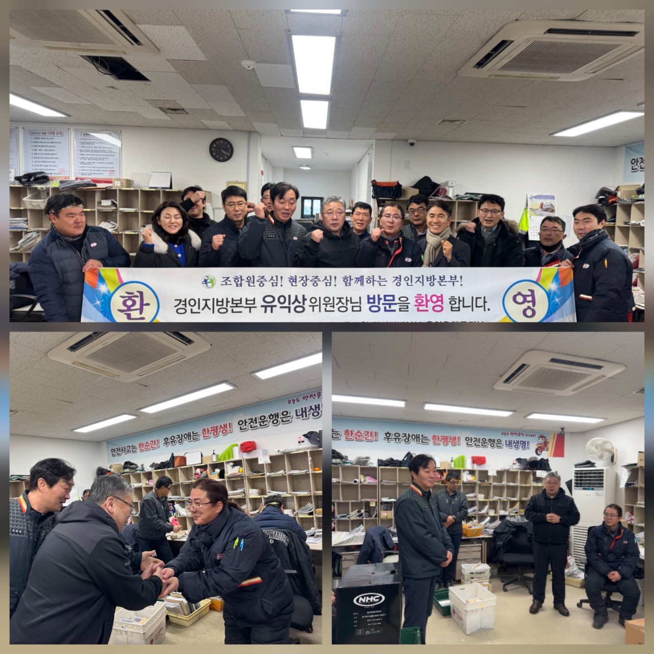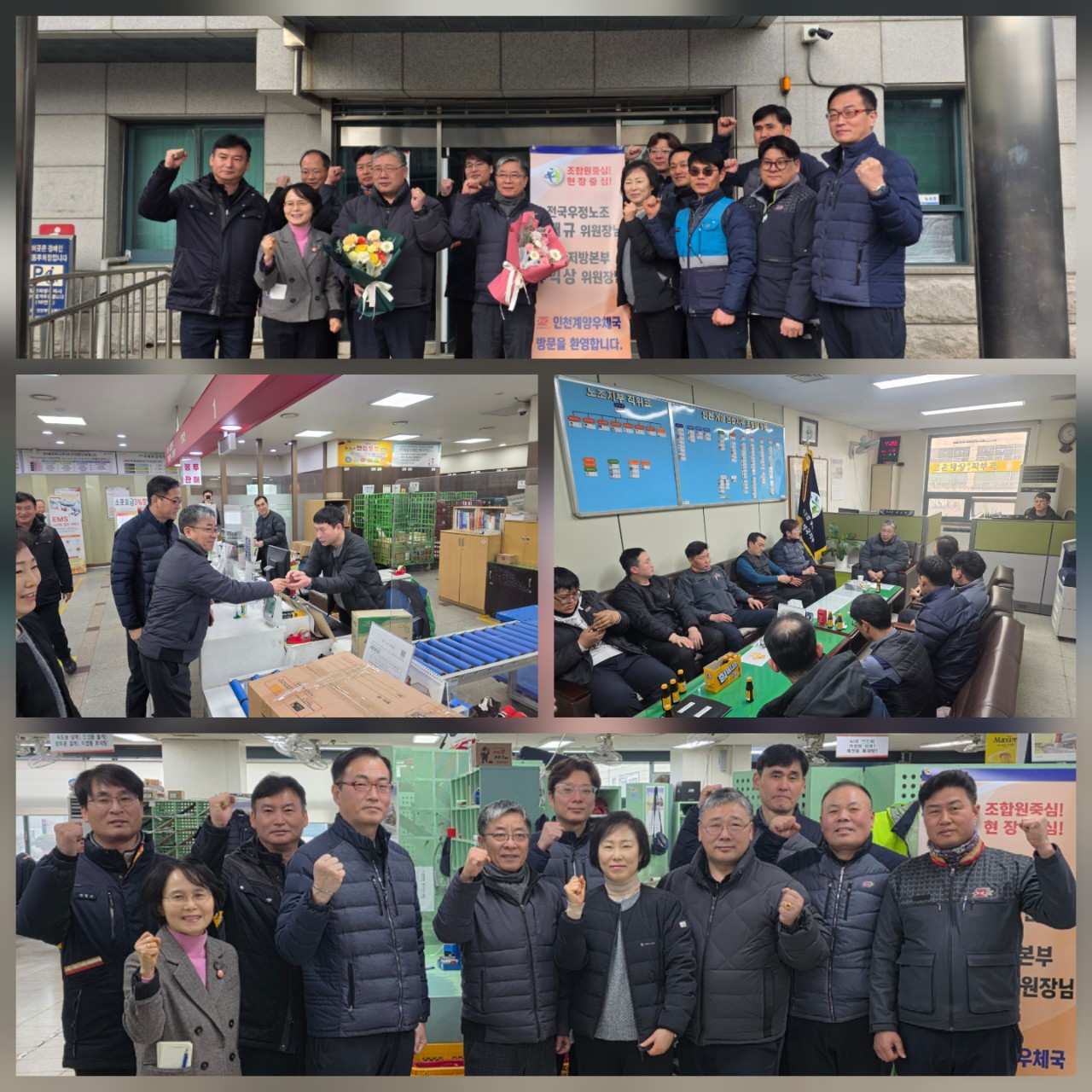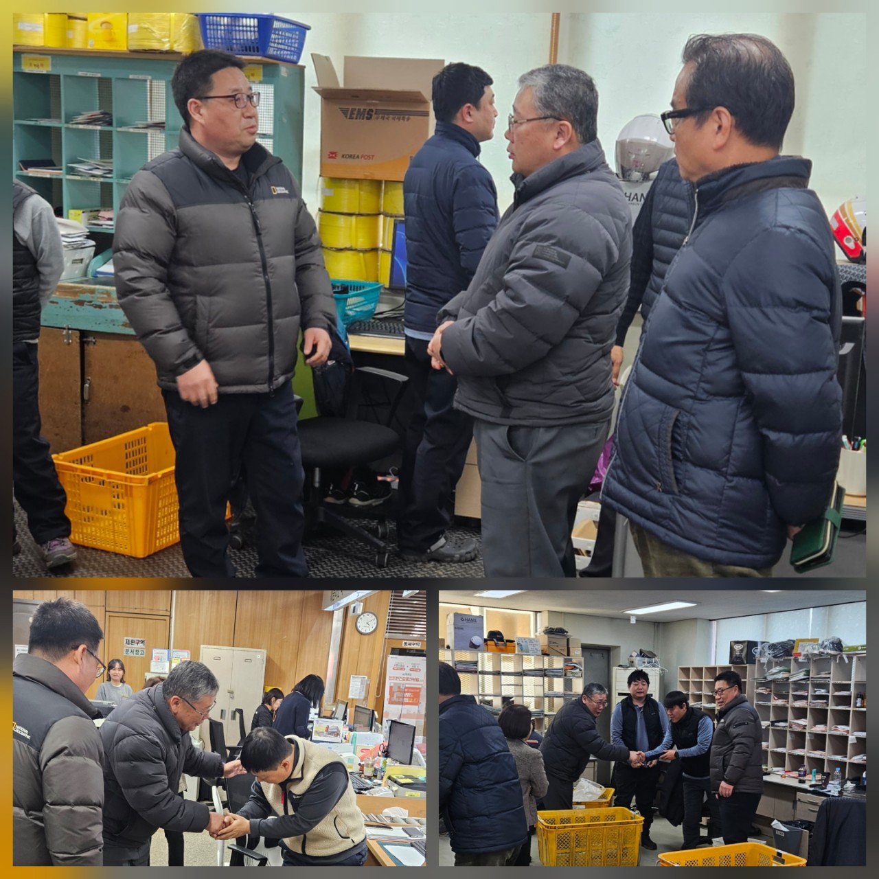 경인지방본부(유익상)는 1.21.(수)~2.3.(화)까지 10곳의 총괄국 및 센터국 설 소통격려 방문을 하였으며, 1.26.(월) 조합본부 이재규 위원장과 함께 김포우체국지부, 계양우체국지부를 방문하여 조합원들을 격려하고 현장의견을 청취하였다.